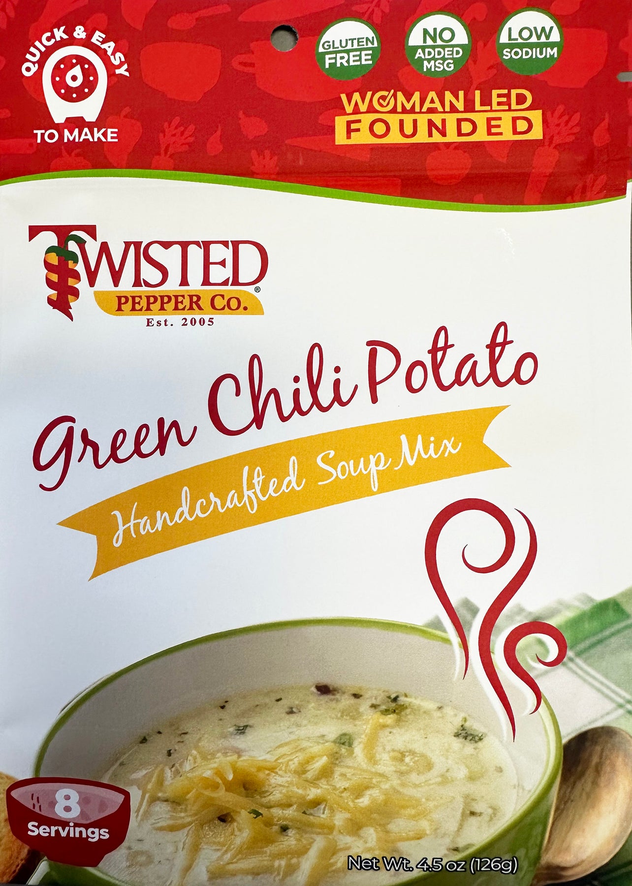We love the Green Chile soup mix. Easy, very tasty, and lower sodium. I often add sausage or carnitas meat to the soup.